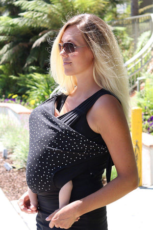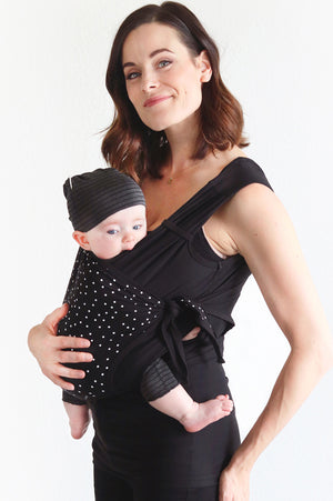 Moms just wanna have fun! Our polka dot pattern features a simple splash of white dots on black for a whimsical yet stylish look. Newborn Baby Carrier | Infant Wrap | Babywearing Shirt.